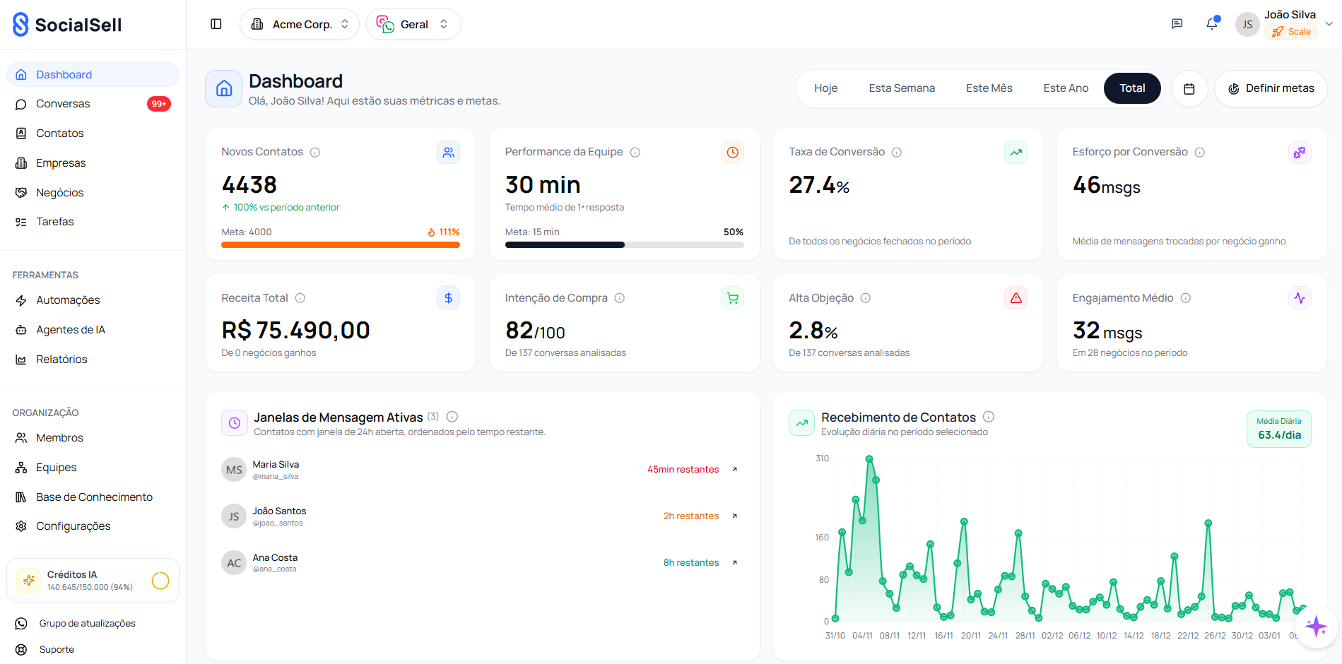 Histórico completo de atividades, mudanças de etapa e interações com cada lead.